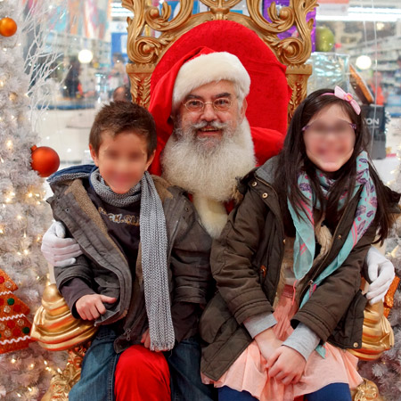 Je joue ce rôle depuis 2014. Avec ma barbe et mes cheveux blancs naturels, les enfants sont persuadés de rencontrer enfin le père Noël *en vrai !* Mon costume de luxe en velours épais avec fourrure blanche et galons brodés de fils d'or leur plait énormément. J’aime les enfants et j’ai toujours une relation douce et teintée de magie avec eux, adaptée à leur âge, sans exclure une certaine complicité avec les parents !